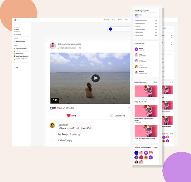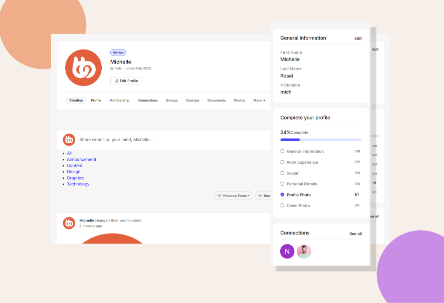 Activity Feed: Complete Profile, Latest Updates, Recent Blog Posts, Active Members