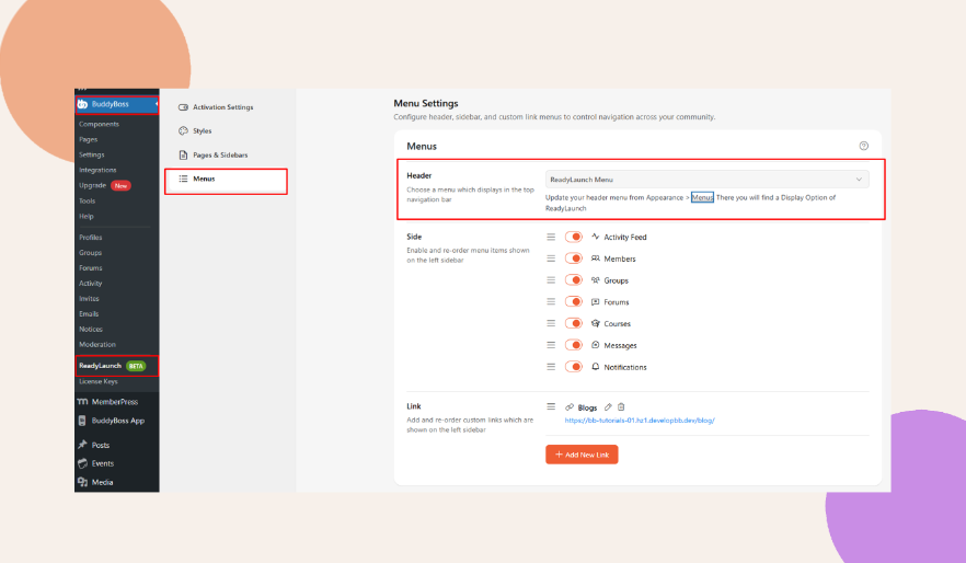 2. Choose the type of menu that you want to use as your Header menu. (e.g., ReadyLaunch Menu).